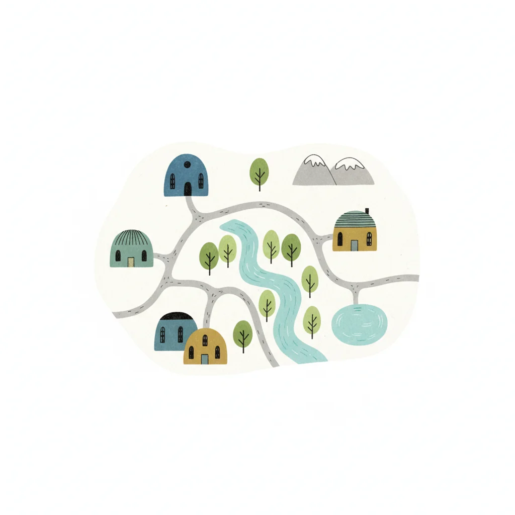 Stilisierte Landschaft mit Häusern, Fluss, Bäumen, Bergen und Wegen in sanften Farben.