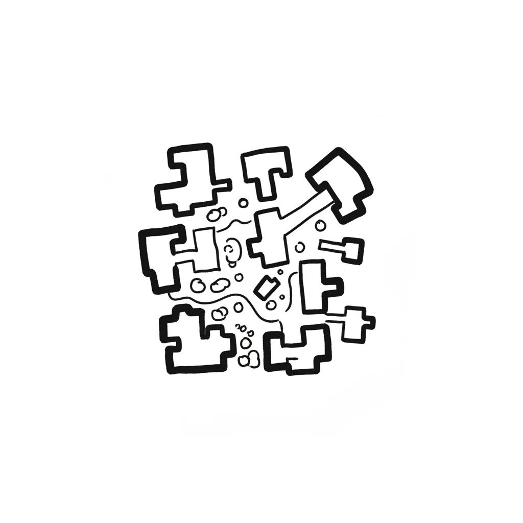 Abstrakte Schwarz-Weiß-Zeichnung aus blockartigen Formen, Linien und Punkten, die an einen Stadtplan erinnert.