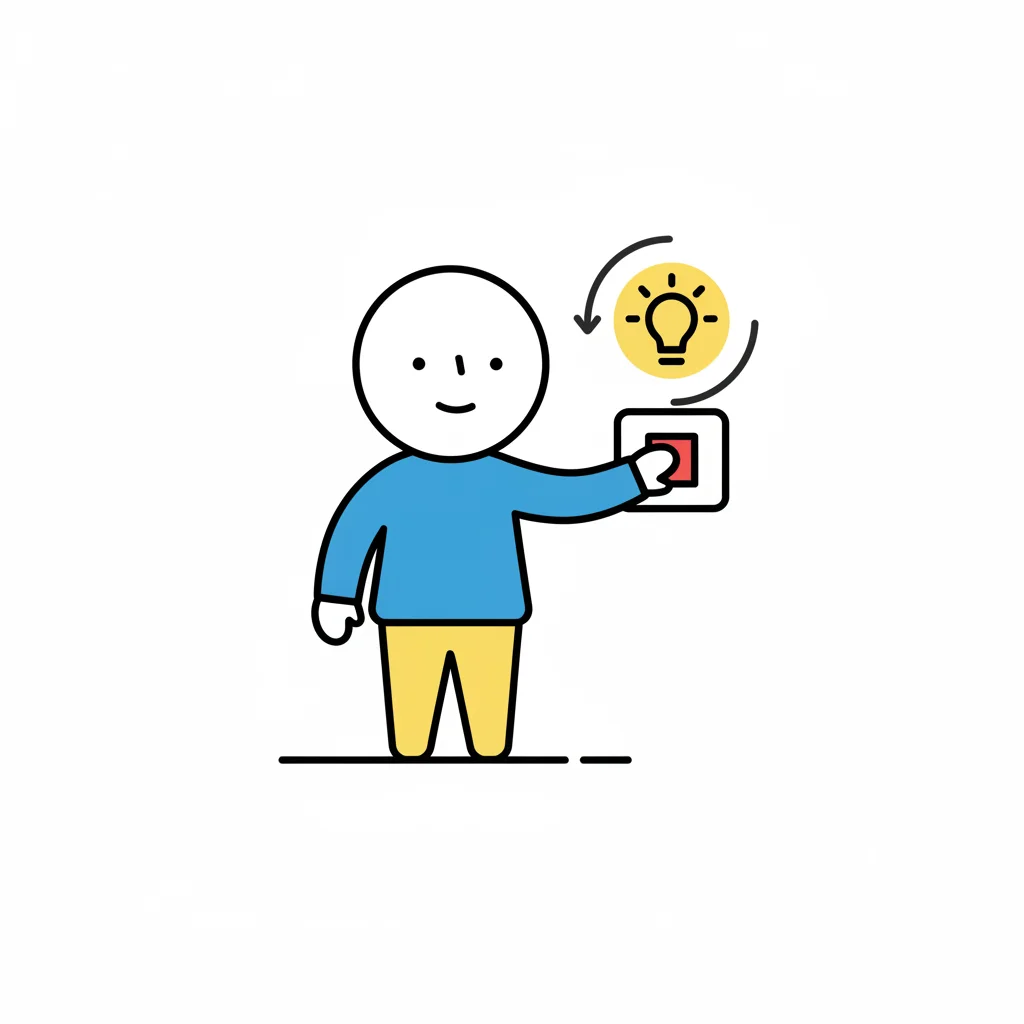 Eine Figur schaltet eine Lampe ein und lächelt.