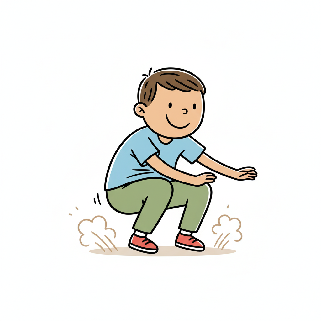 Ein lächelnder Cartoon-Junge hockt sich hin, mit Bewegungslinien um seine Füße.