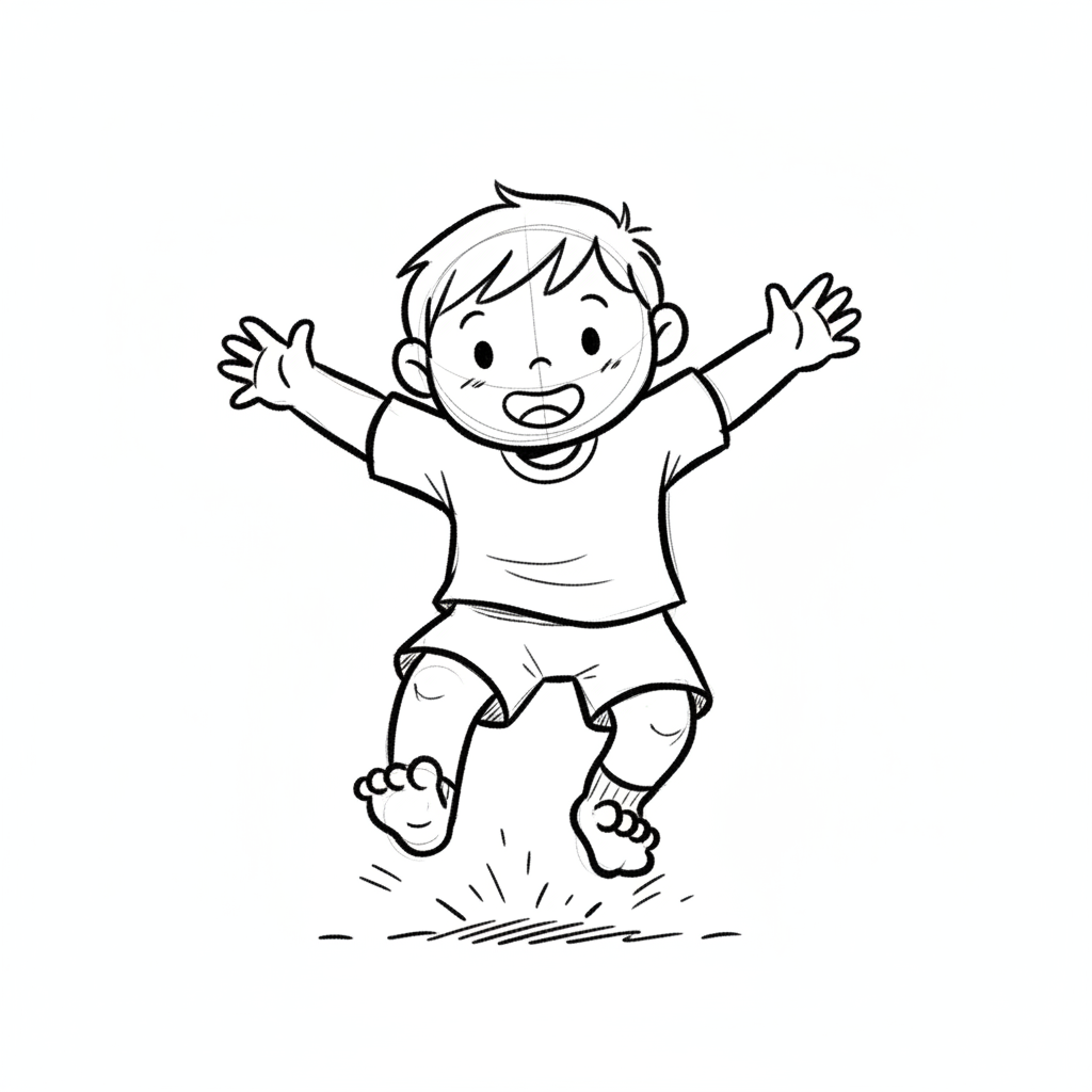 Schwarz-weiß-Zeichnung eines fröhlichen Jungen, der mit ausgestreckten Armen springt.