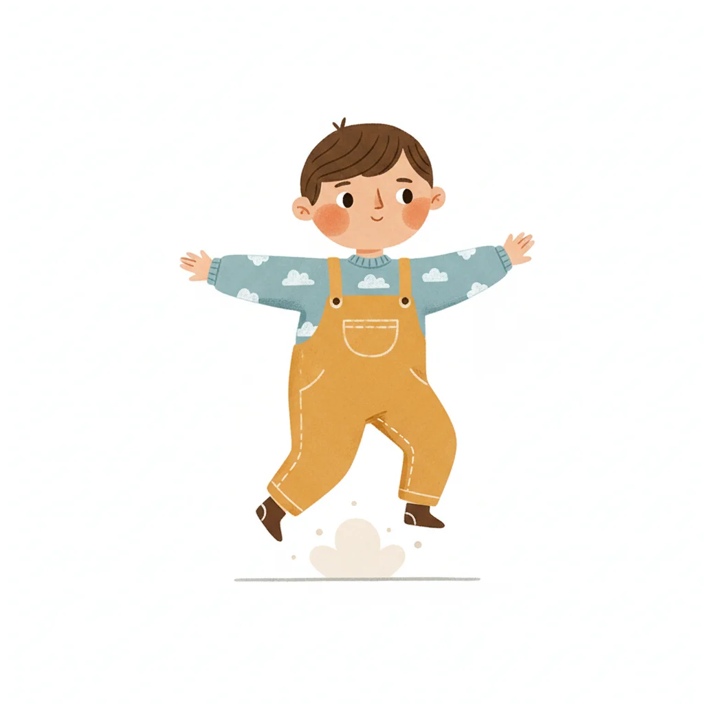 Blondes Cartoon-Kind in Latzhose springt glücklich mit ausgestreckten Armen.