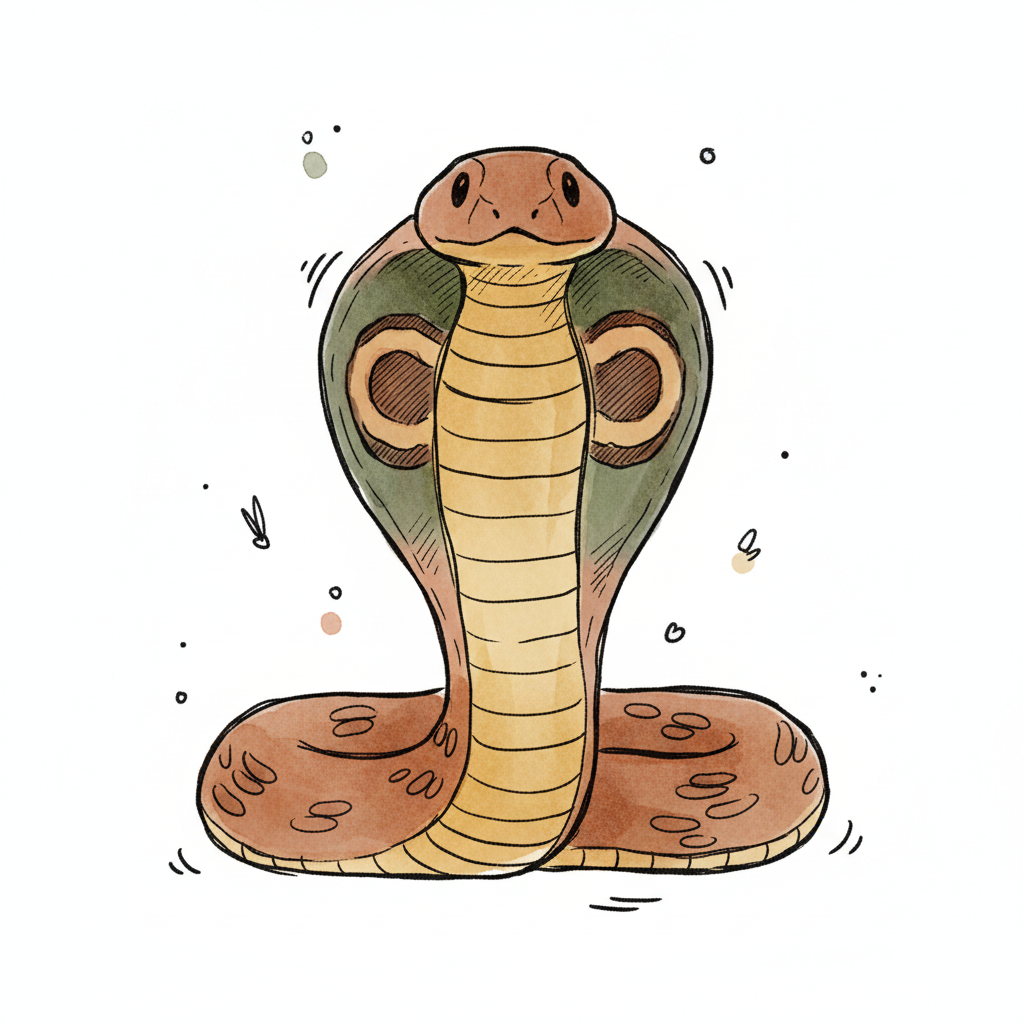 Niedliche Aquarell-Illustration einer aufgerichteten Kobra mit gespreiztem Hals.