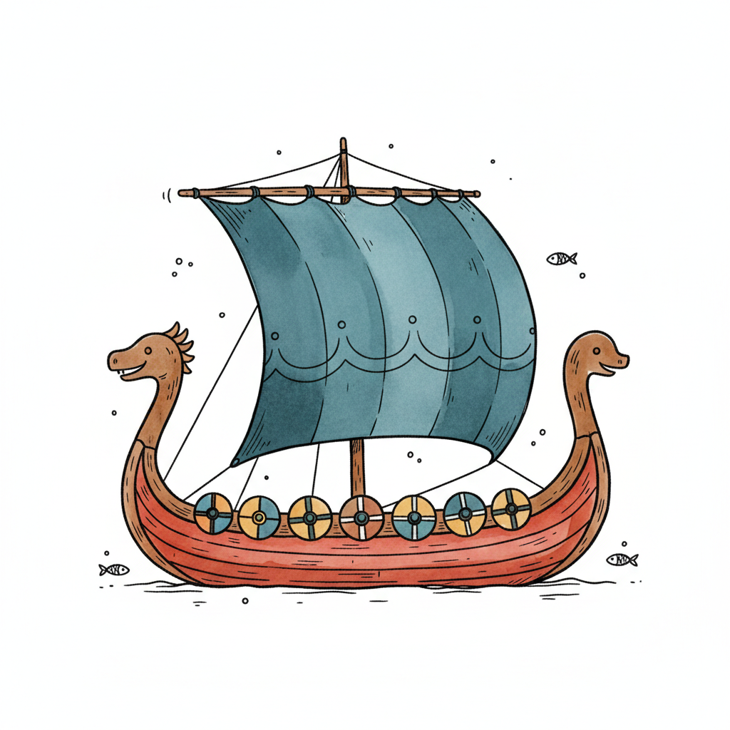 Niedliches Wikingerschiff mit blauem Segel, Drachenköpfen und bunten Schilden im Cartoon-Stil.
