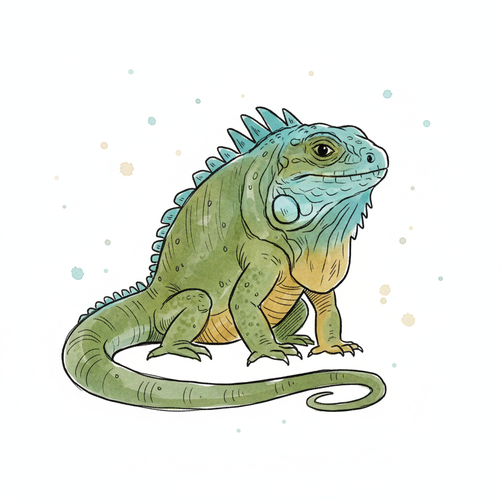 Grüne Leguan-Illustration im Aquarellstil mit stacheligem Rücken und langem Schwanz.