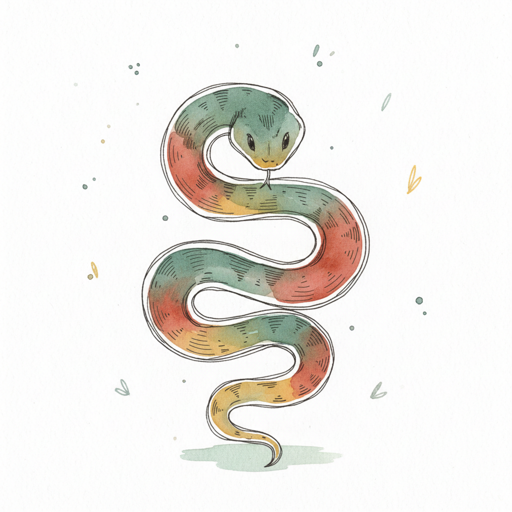 Aquarell-Illustration einer bunten Schlange mit grünen, roten und gelben Farbtönen auf weißem Hintergrund.