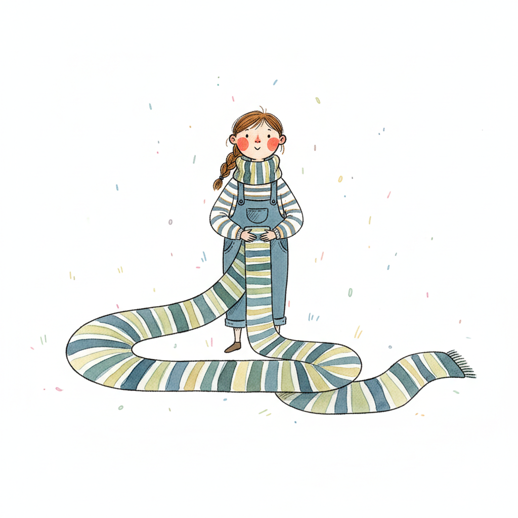 Niedliches Mädchen mit einem endlos langen, gestreiften Schal in Aquarell-Illustration.