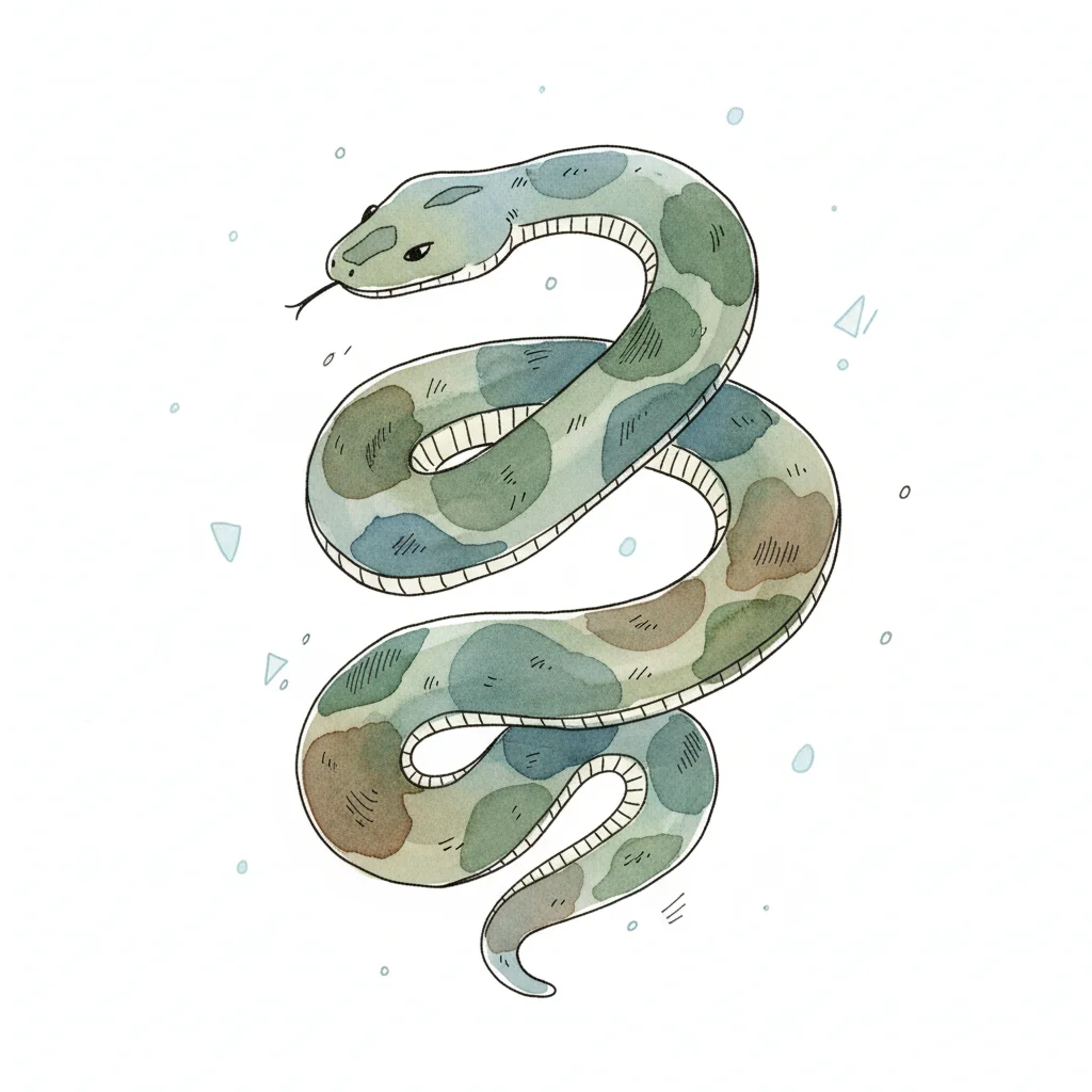 Illustration einer zusammengerollten Schlange in Aquarellfarben mit braunen und grünen Schuppen.