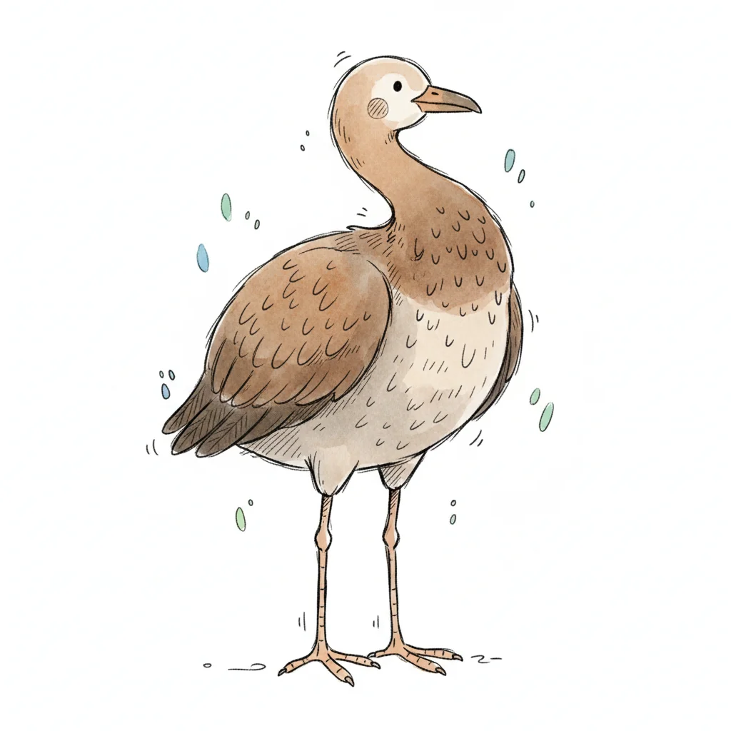 Niedliche, braune Vogelillustration mit langen Beinen und Farbspritzern im Aquarellstil.