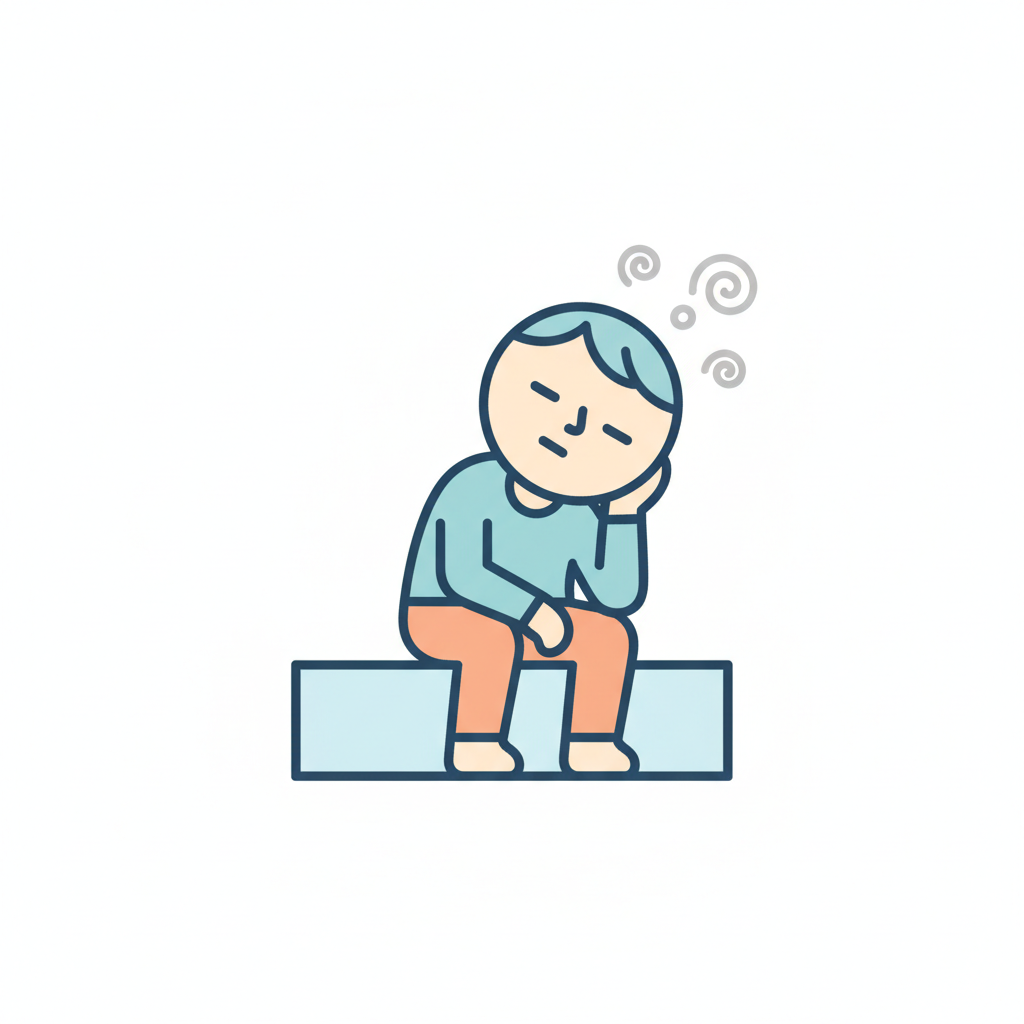 Handgezeichnete Kinderbuchillustration im modernen skandinavisch-nordischen Stil. Minimalistische, freundliche Figur mit einfachen Formen und leicht unregelmäßigen, handgezeichneten Linien. Ruhige, gedeckte Farbpalette, viel freie Fläche, reduzierte Details, sanfte Papier- oder Aquarellstruktur. Warme, ruhige, leicht humorvolle Stimmung, flächige Komposition ohne starke Perspektive, moderner nordischer Illustrationsstil, charmant und zeitlos.
