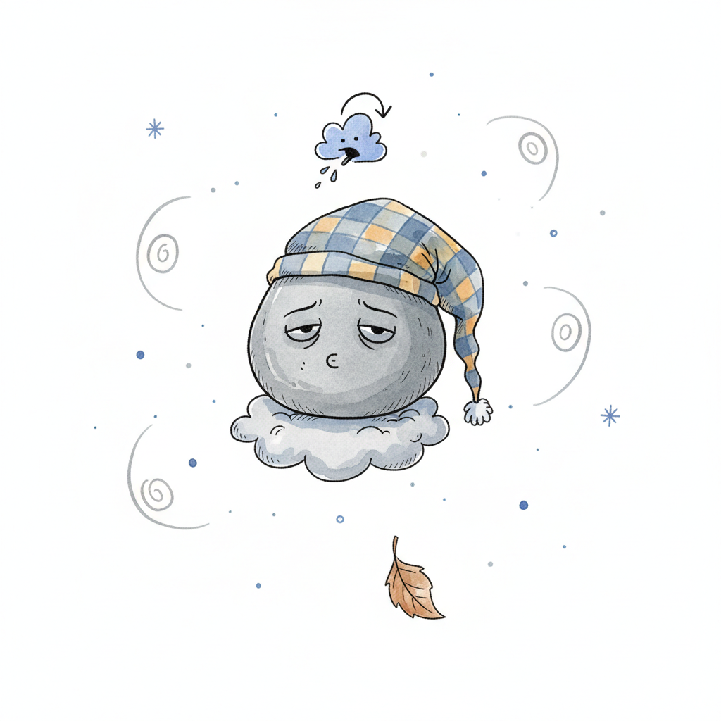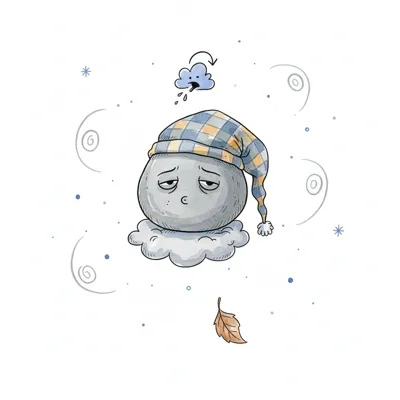 Ein müder Wolkenball mit Schlafmütze und traurigem Gesicht auf einer Wolke.