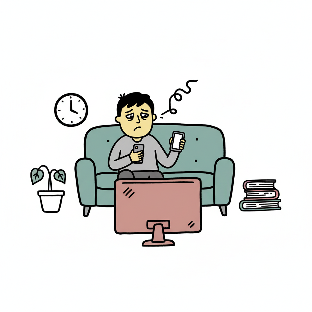 Ein Mann sitzt unzufrieden auf einer Couch und schaut auf sein Handy und den Fernseher.