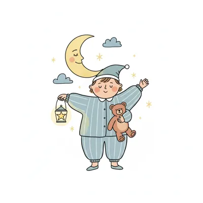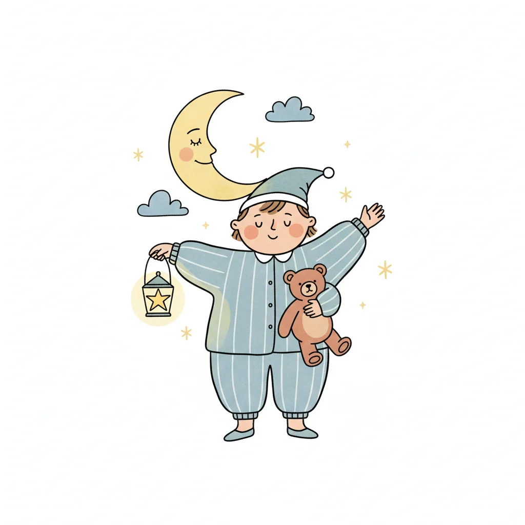 Ein glücklicher Junge mit Laterne und Teddy unter dem Mond.