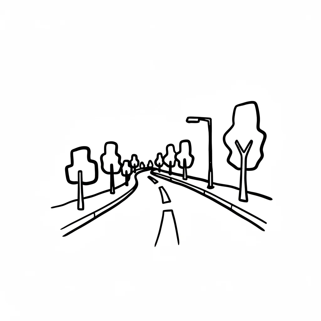 Eine einfache, skizzierte Straße mit Bäumen und einer Laterne.