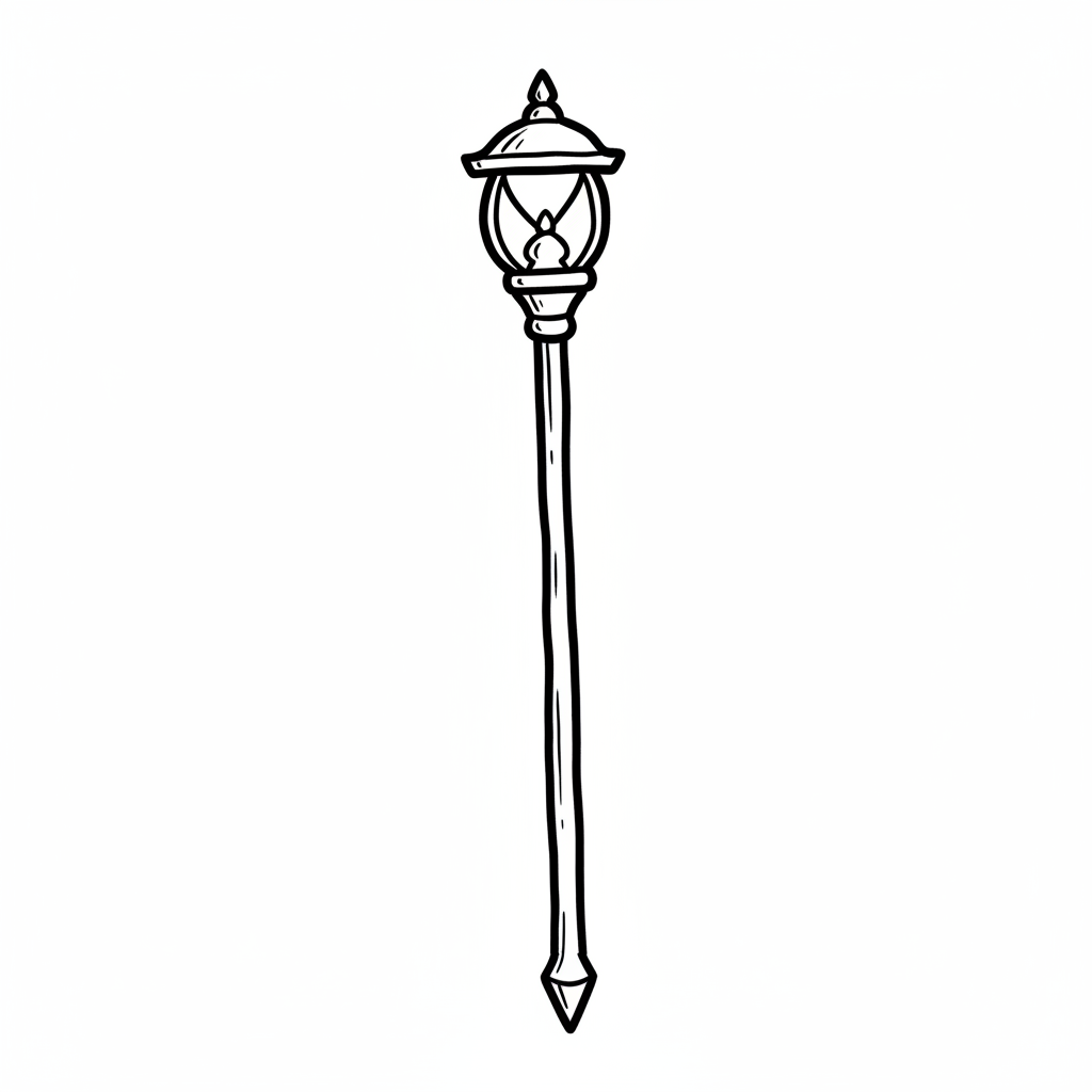 Illustration eines Holzstabs mit leuchtender Laterne, umgeben von Runen auf weißem Grund.