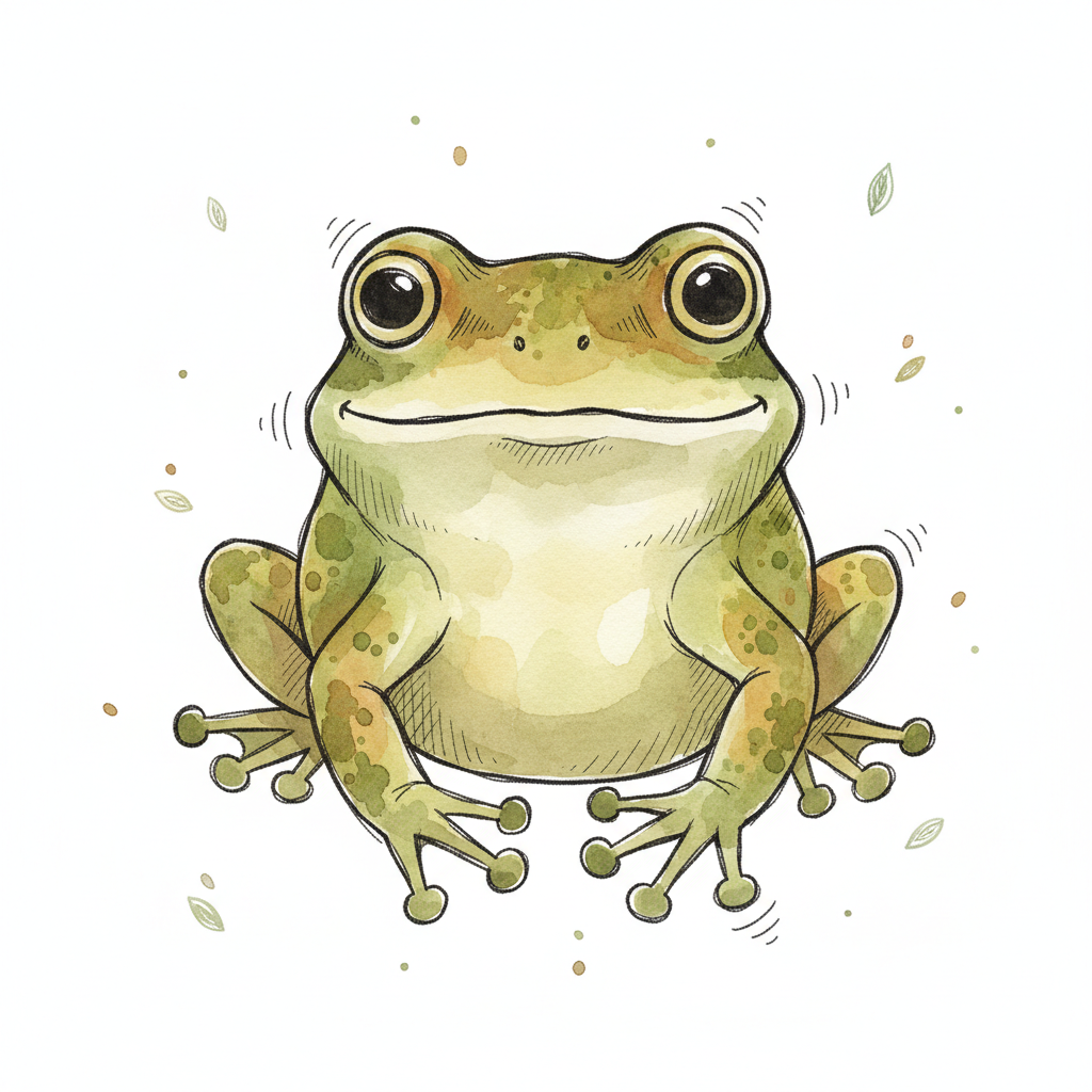 Eine stilisierte Froschzeichnung in sanften Farben mit großen Augen.
