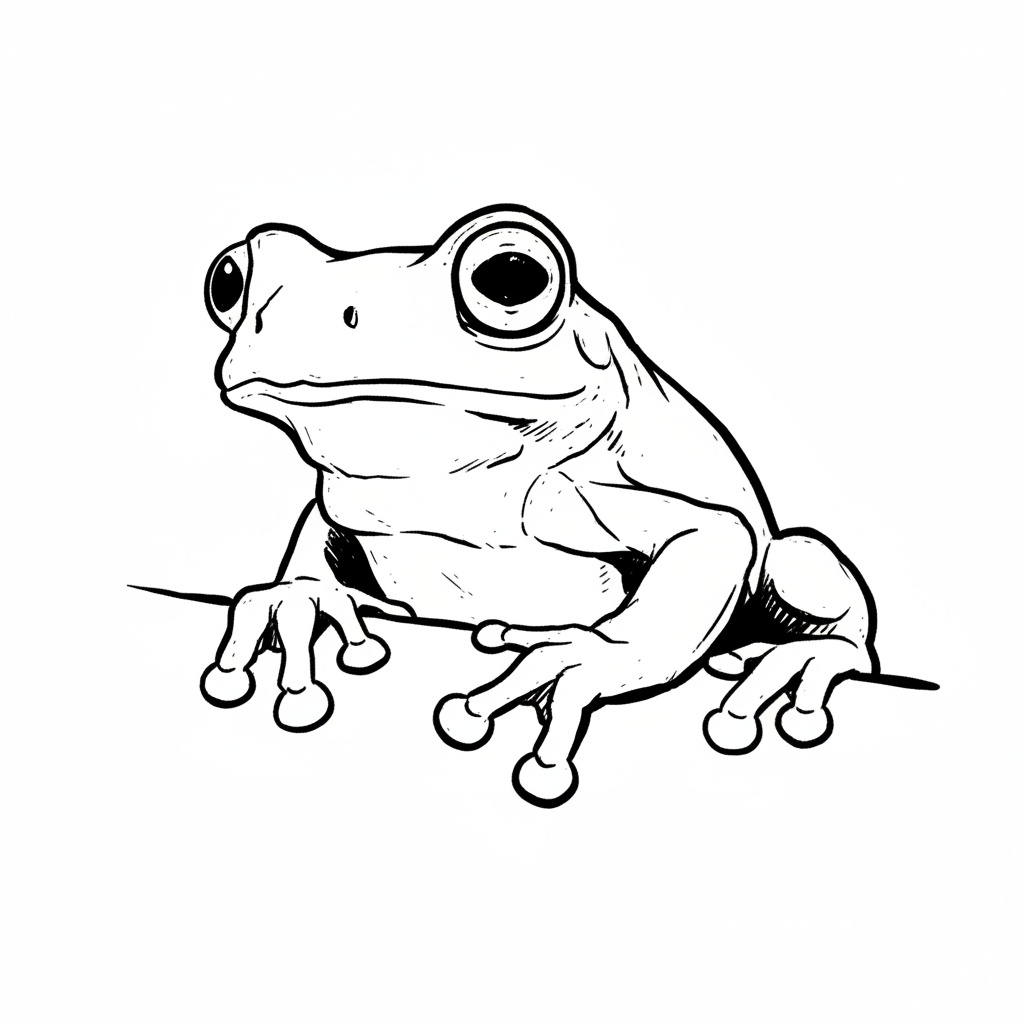 Eine skizzenhafte Darstellung eines Frosches mit großen Augen.