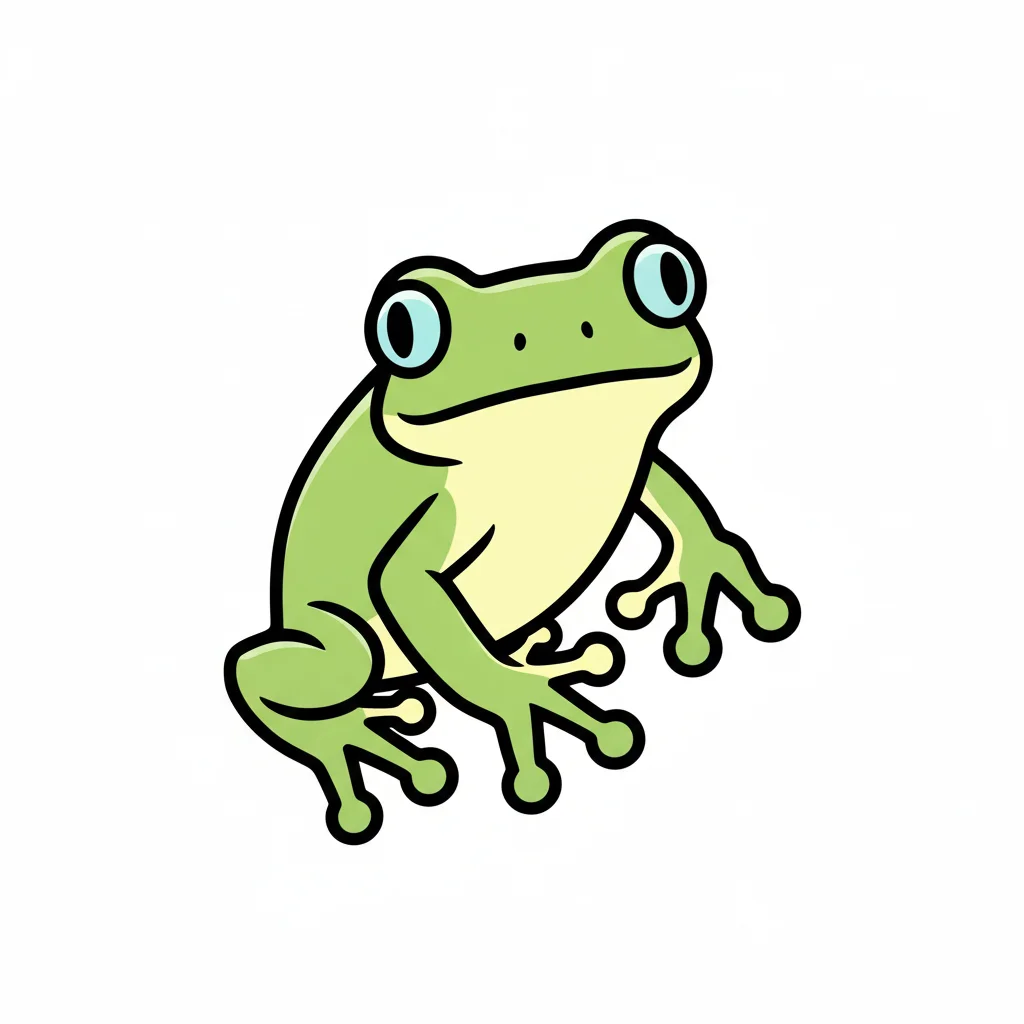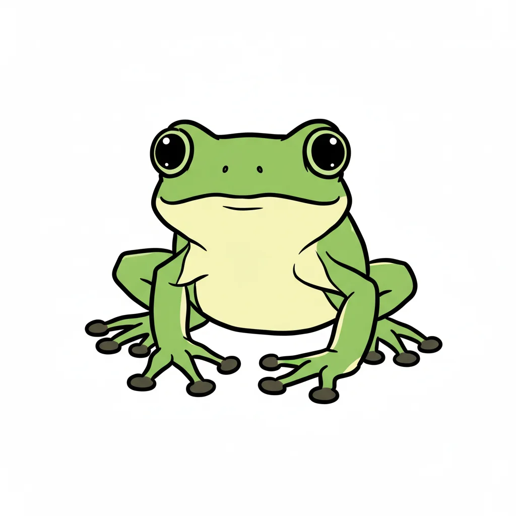 Ein niedlicher, cartoonartiger Frosch mit großen Augen sitzt.