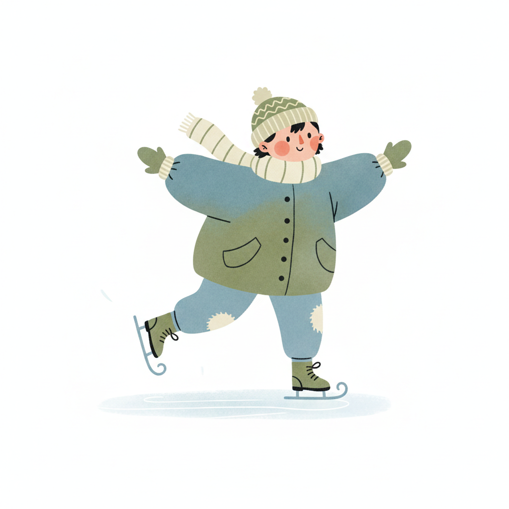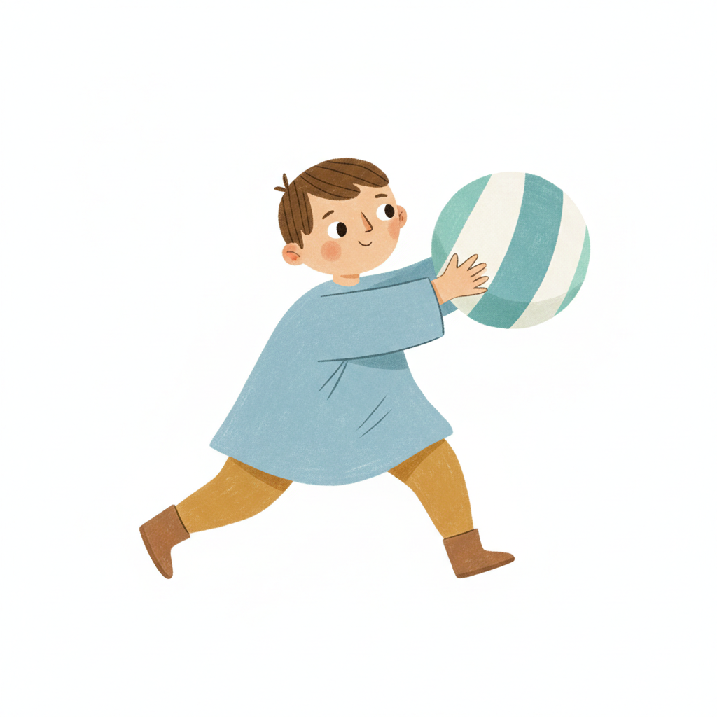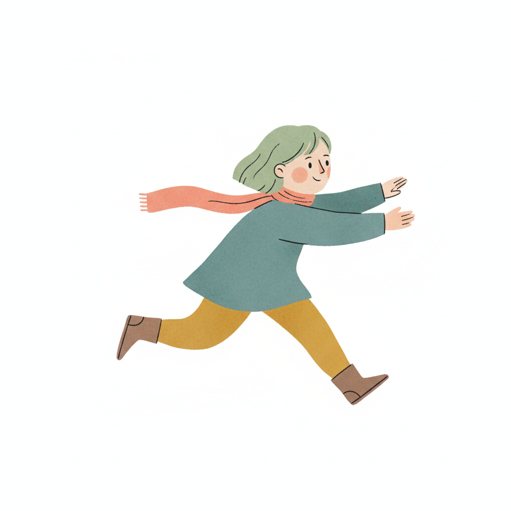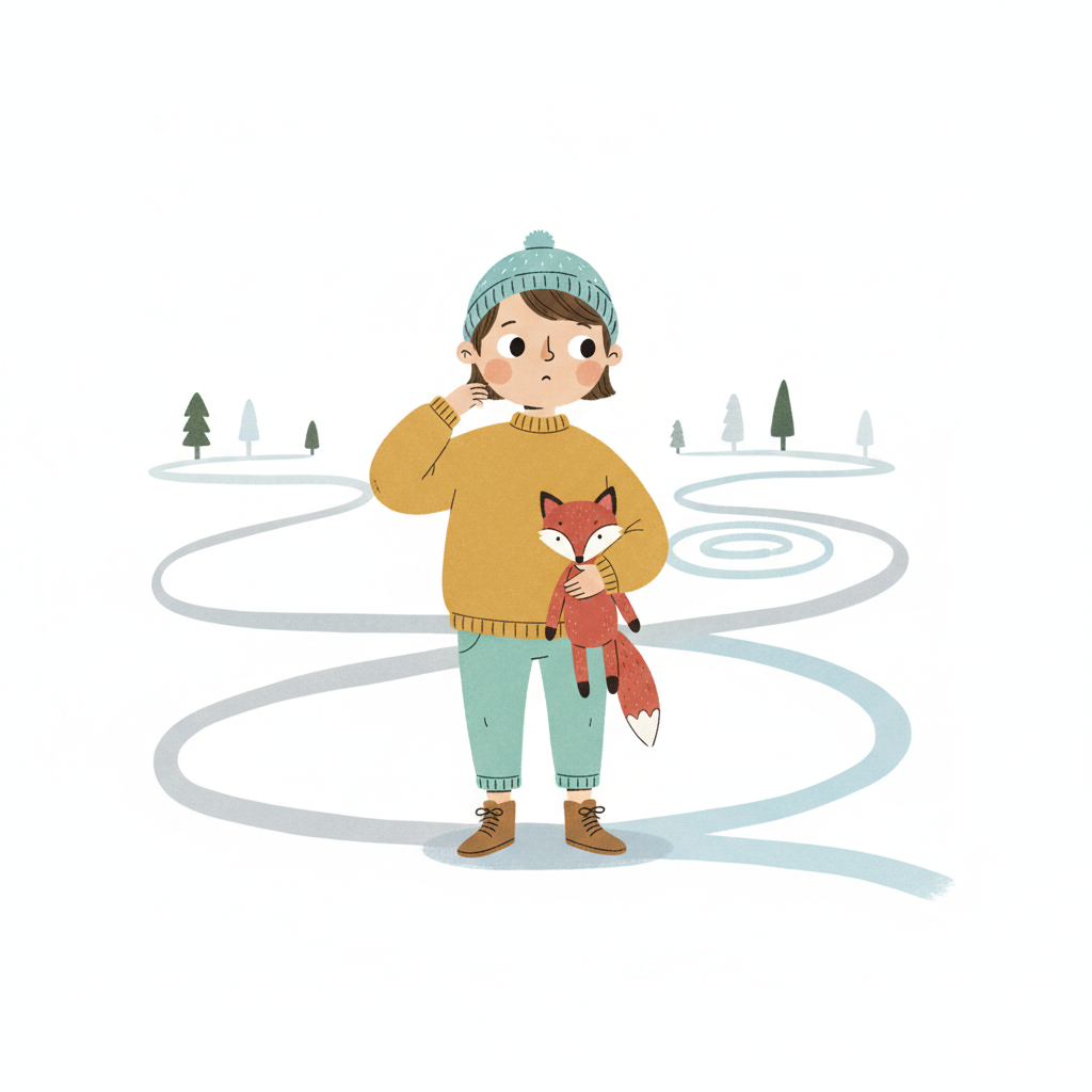 Handgezeichnete Kinderbuchillustration im modernen skandinavisch-nordischen Stil. Minimalistische, freundliche Figur mit einfachen Formen und leicht unregelmäßigen, handgezeichneten Linien. Ruhige, gedeckte Farbpalette, viel freie Fläche, reduzierte Details, sanfte Papier- oder Aquarellstruktur. Warme, ruhige, leicht humorvolle Stimmung, flächige Komposition ohne starke Perspektive, moderner nordischer Illustrationsstil, charmant und zeitlos.