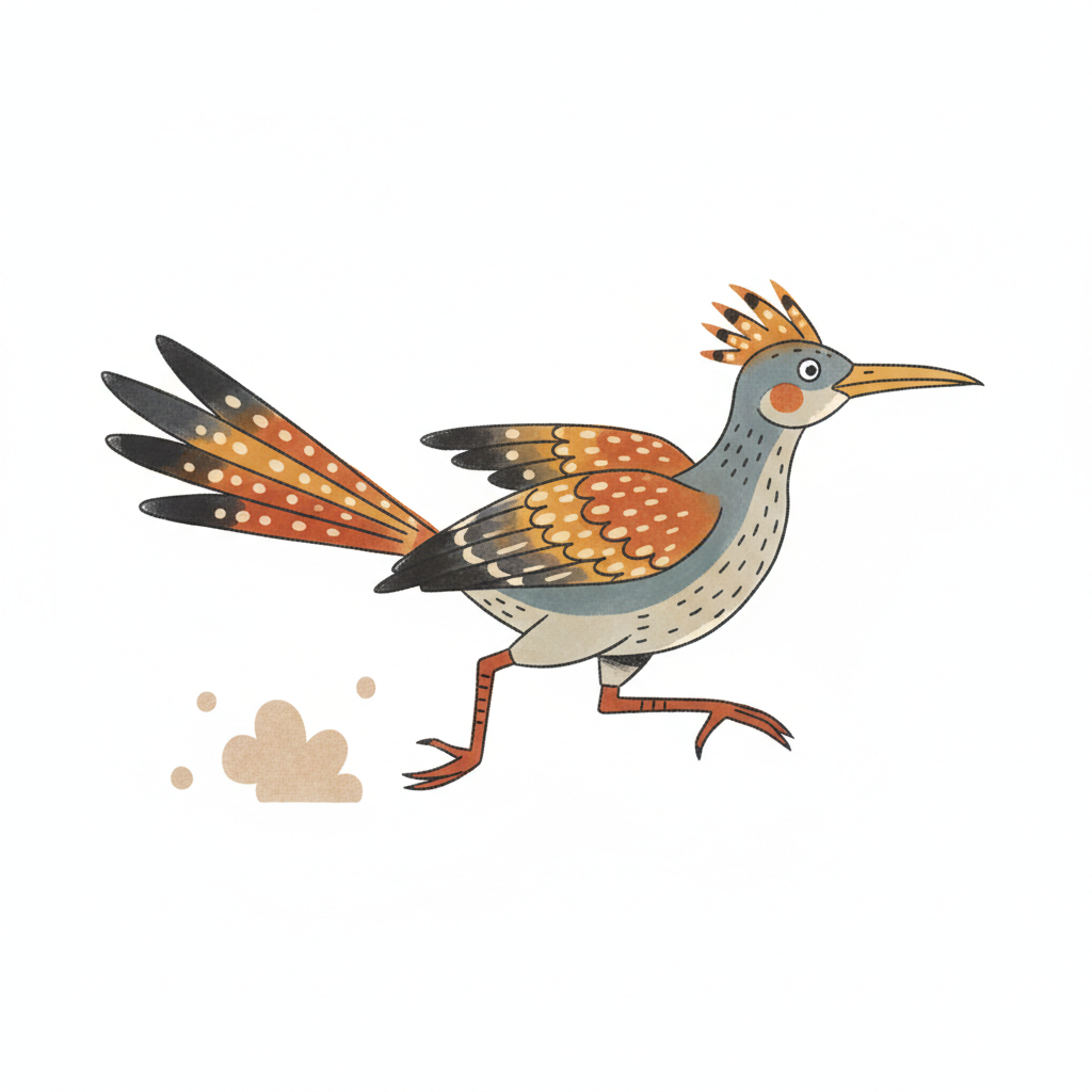 Bunter, stilisierter Vogel rennt über den Boden.
