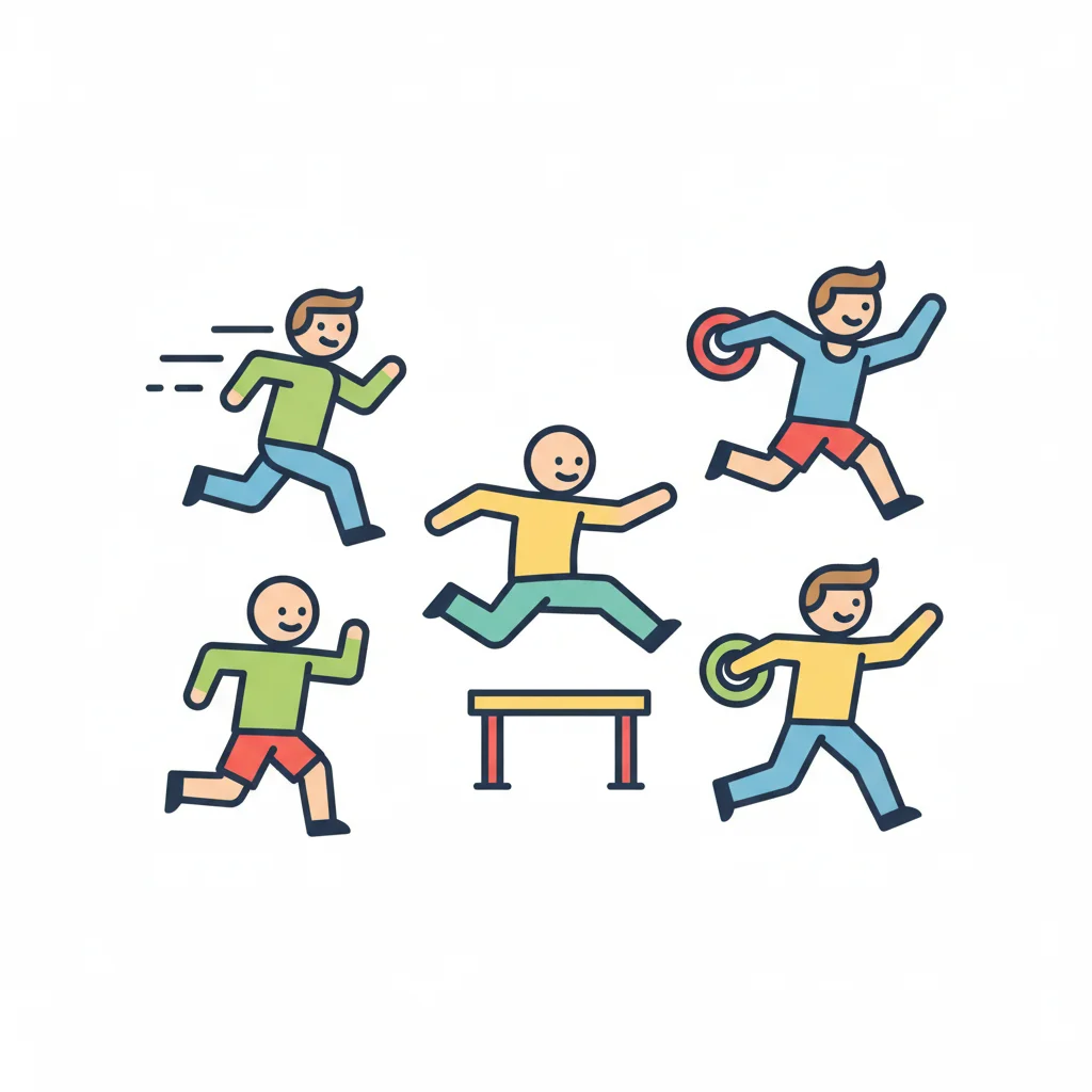 Fünf cartoonartige Figuren beim Sport, Laufen und Hindernis überwinden.