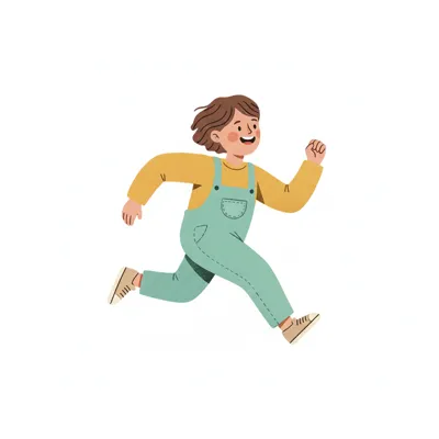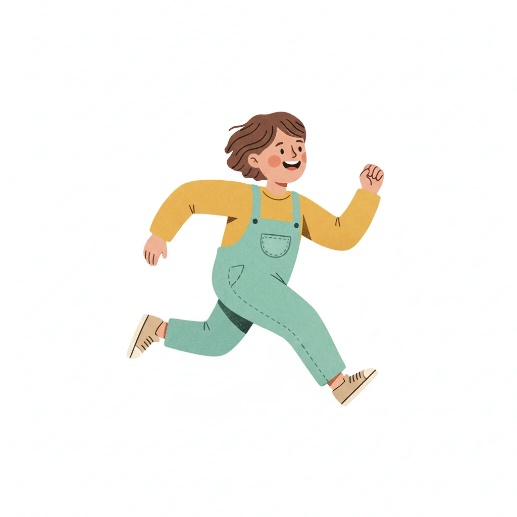 Ein fröhliches Kind in Latzhose läuft spielerisch und voller Energie.