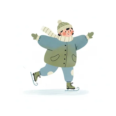 Ein fröhlicher Junge skatet im Winteroutfit auf dem Eis.
