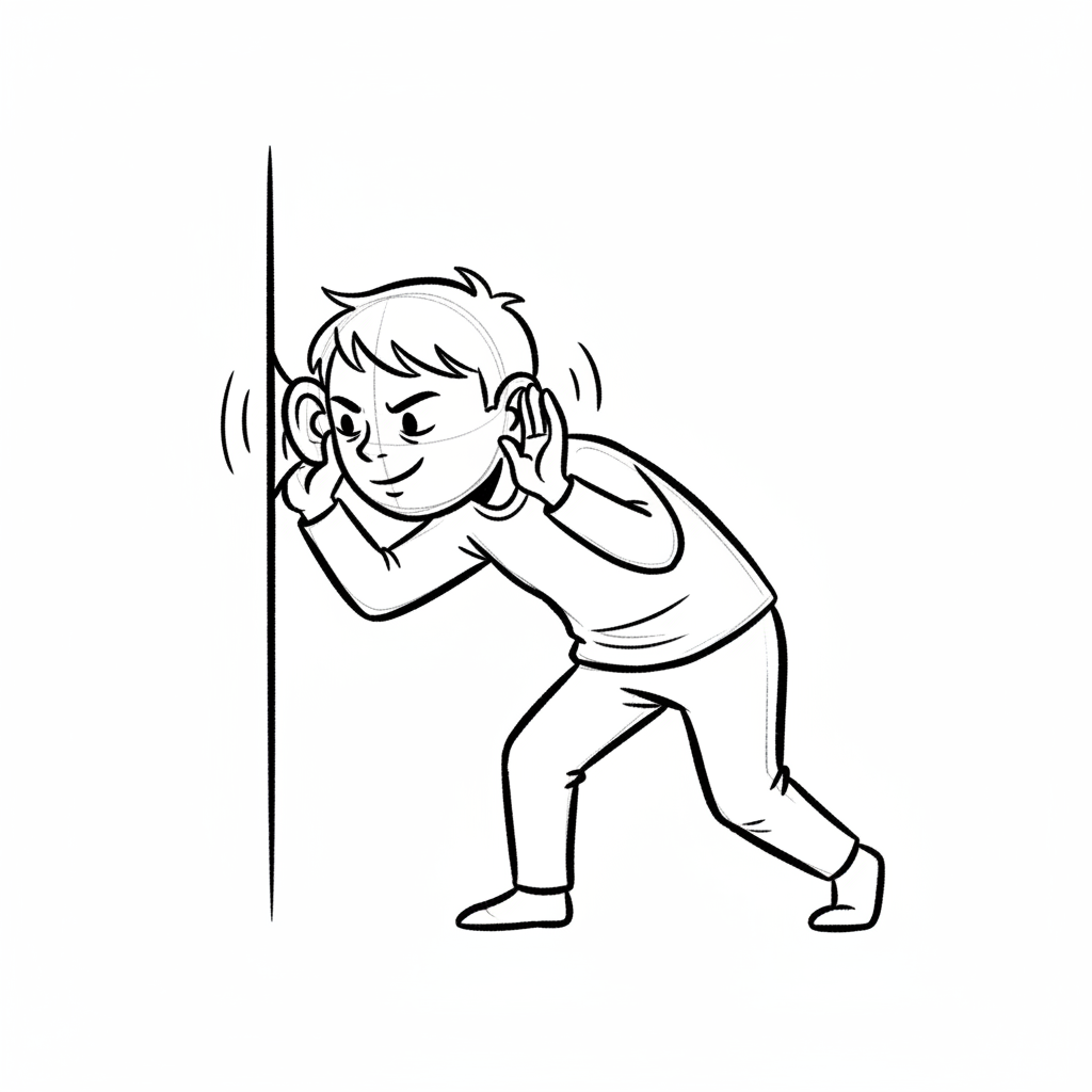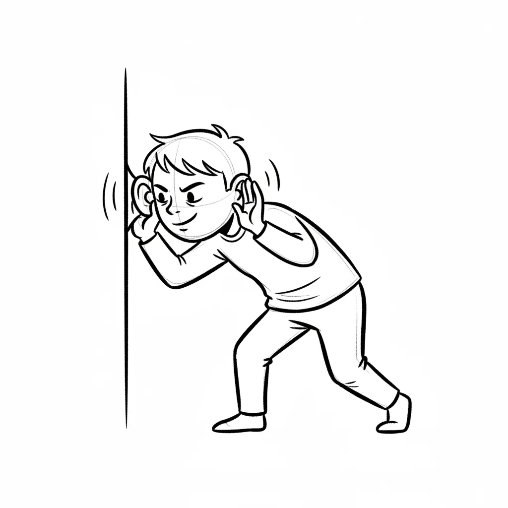 Ein Junge lauscht aufmerksam an einer Wand, die Ohren gespitzt, um Geräusche wahrzunehmen.