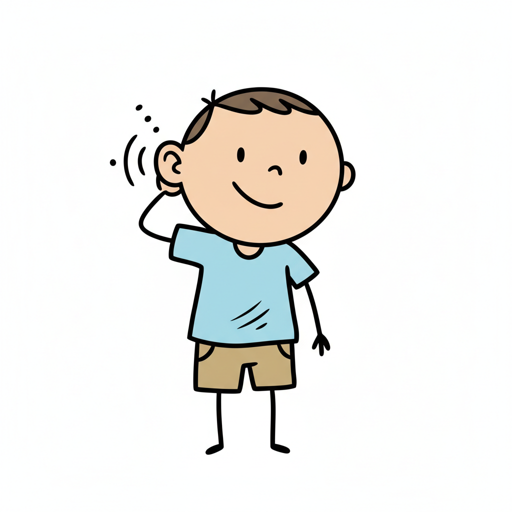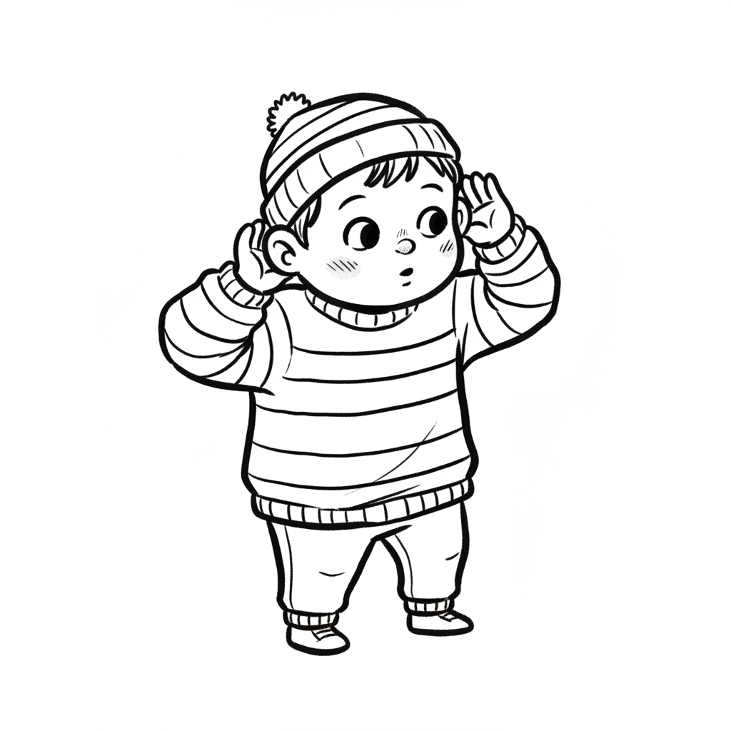 Niedlicher Cartoon-Junge mit Mütze und Pullover, der mit der Hand am Ohr aufmerksam lauscht.