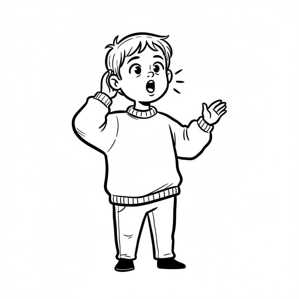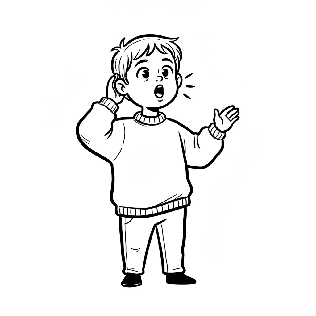 Schwarz-weiß-Zeichnung eines Jungen, der lauscht oder spricht, mit Hand am Ohr.