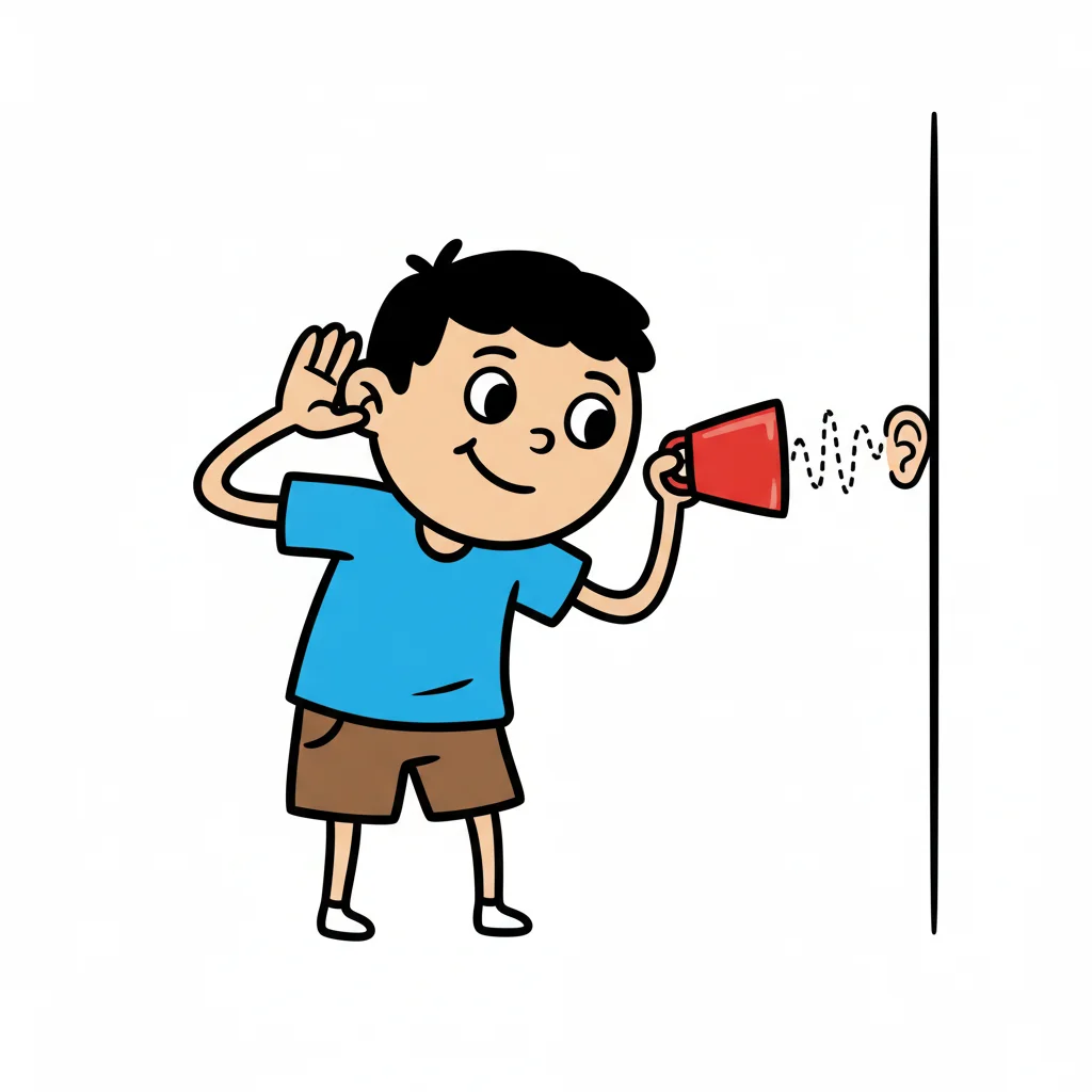 Cartoonjunge lauscht mit Becher und Hand an einer Wand, um Geräusche zu hören.