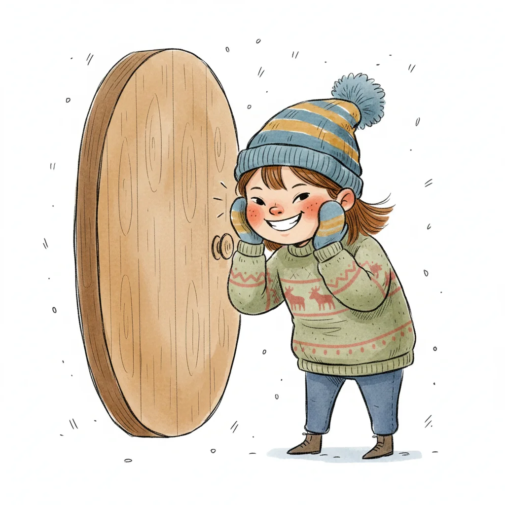 Ein fröhliches Mädchen in Winterkleidung lauscht gespannt an einer Holztür.