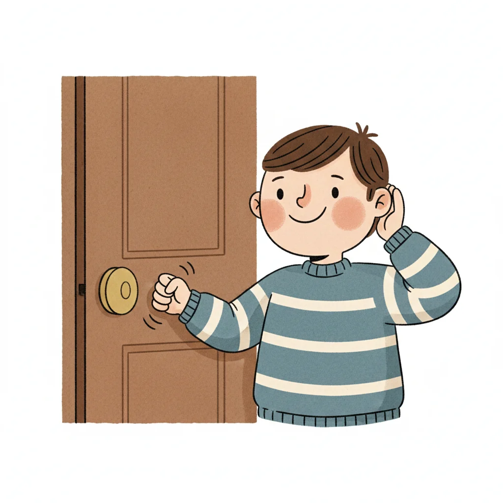 Ein Junge klopft an eine Tür und lauscht gespannt, ob jemand öffnet.