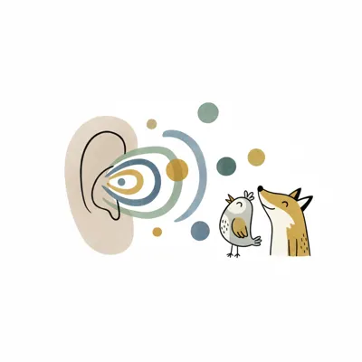 Ein Ohr empfängt Schallwellen von einem singenden Vogel und einem lauschenden Fuchs.