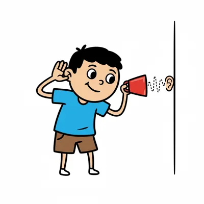 Ein lächelnder Cartoon-Junge lauscht mit der Hand am Ohr, um besser zu hören.