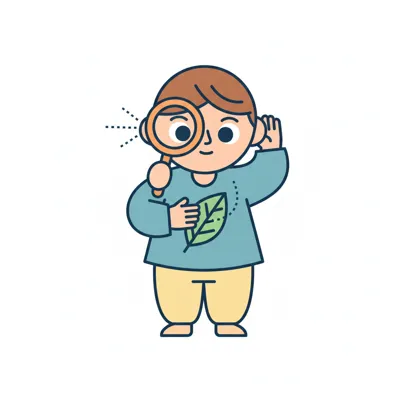 Kindliches Cartoon mit Lupe, Blatt und lauschendem Ohr, Natur erkundend.