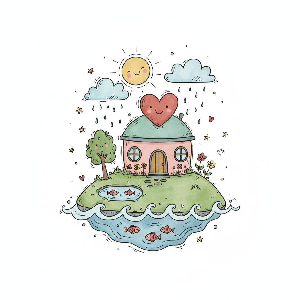 Niedliches Cartoon-Haus auf Insel mit lächelndem Herz, Sonne, Regen und Fischen im Wasser.