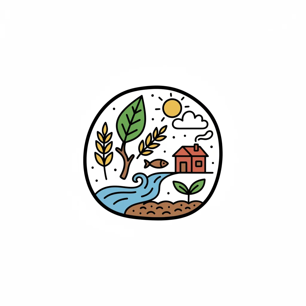 Monoline-Illustration: Haus am Fluss, umgeben von Natur mit Pflanzen, Sonne und Fisch.