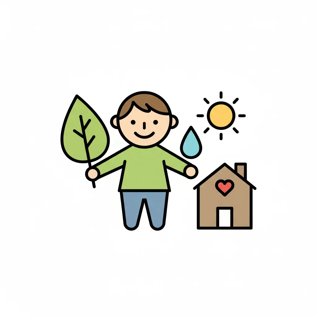 Glückliche Figur mit Blatt, Sonne, Wassertropfen und Haus mit Herz, symbolisiert Umwelt und Heim.