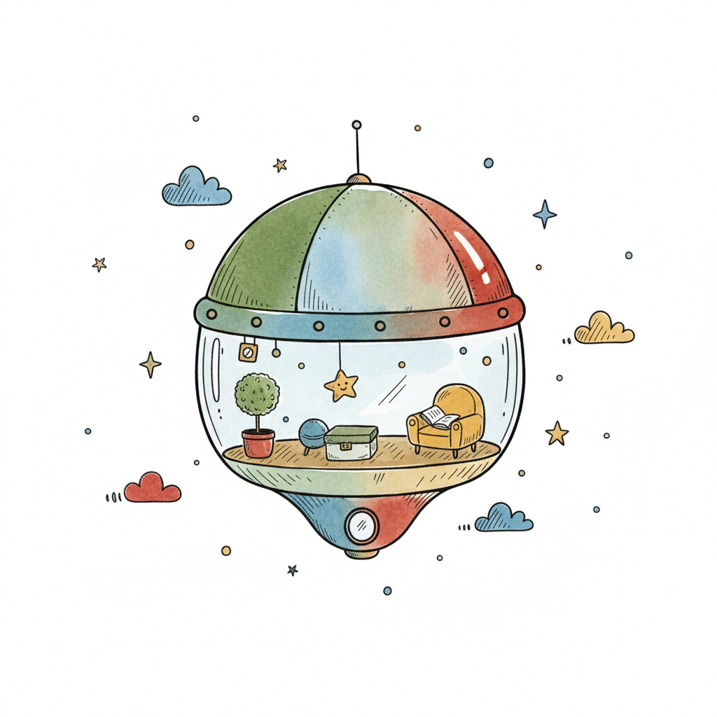 Gemütliches Zimmer in einer schwebenden Kugel mit Wolken und Sternen, im Aquarell-Stil.
