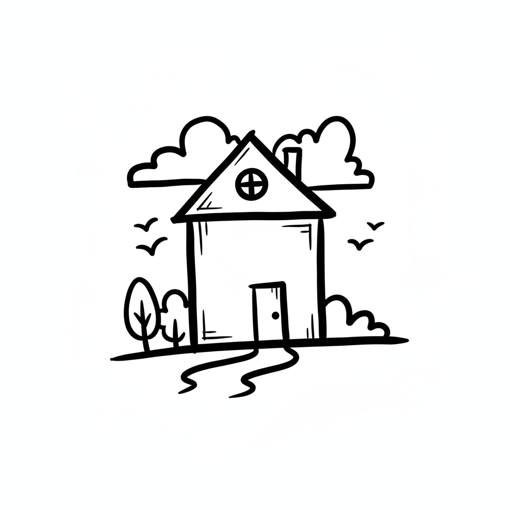Handgezeichnetes Haus mit Garten, Wolken und Vögeln im Doodle-Stil.