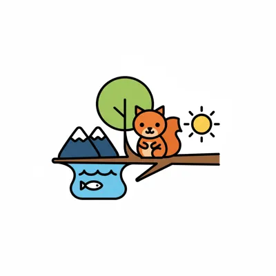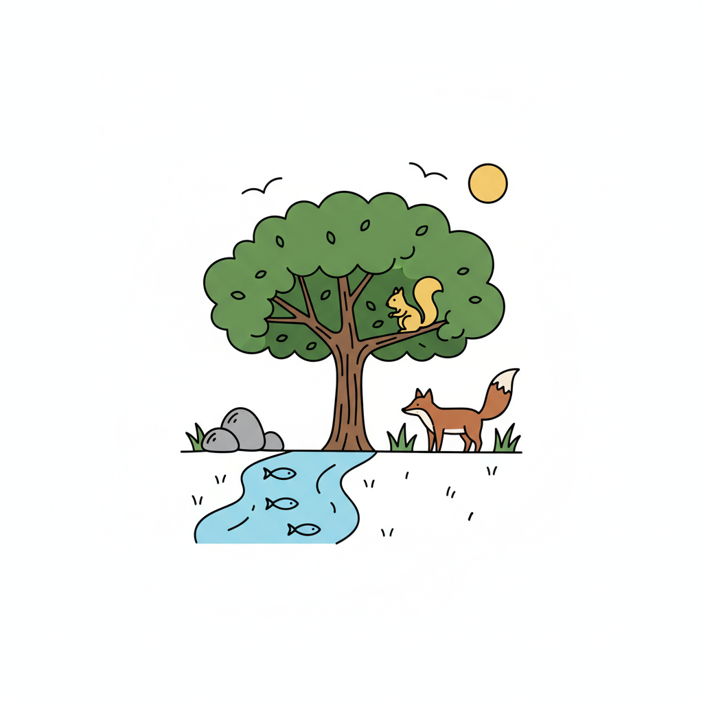 Niedliche Cartoon-Illustration einer Naturlandschaft mit Baum, Eichhörnchen, Fuchs, Fluss und Fischen.