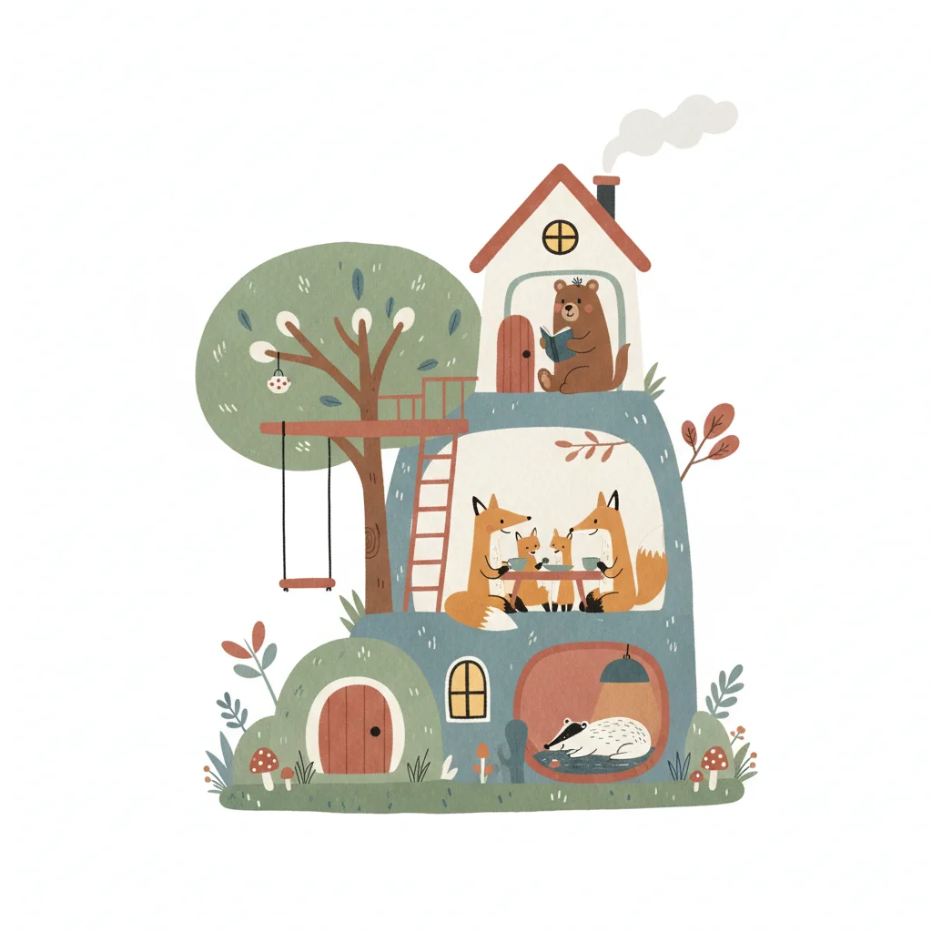 Niedliche Illustration eines mehrstöckigen Tierhauses mit Bär, Fuchs-Familie und Dachs.