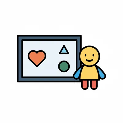 Ein bunter Charakter zeigt Formen auf einer Tafel.