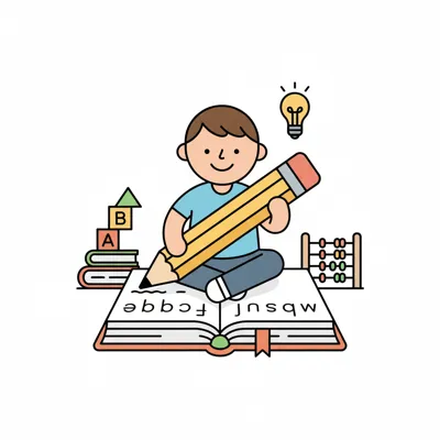 Cartoon-Junge schreibt mit großem Bleistift auf Buch, umgeben von Lernmaterialien.