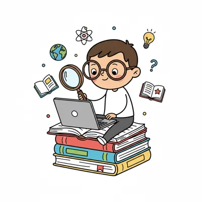 Cartoon-Junge mit Brille sitzt auf Büchern, nutzt Laptop & Lupe, umgeben von Lernsymbolen.
