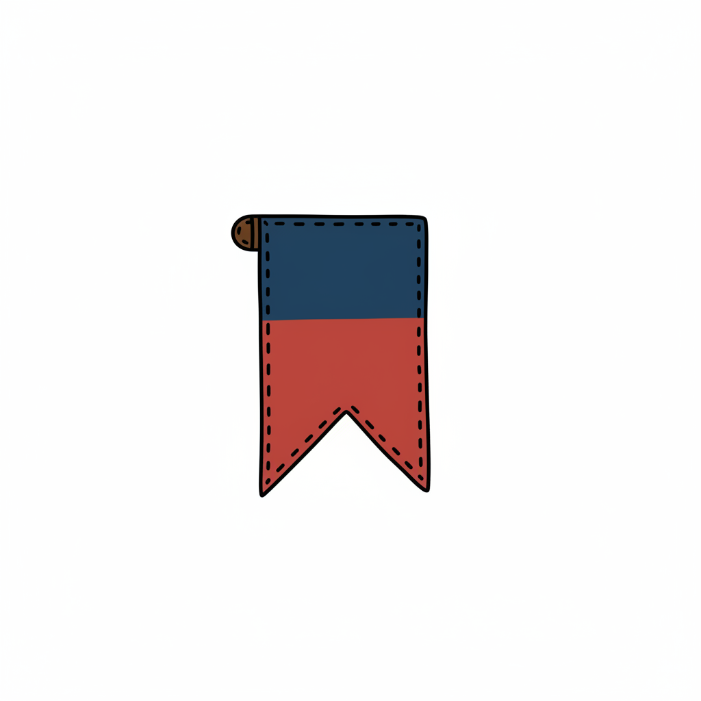 Blau-rotes Lesezeichen/Banner mit gestrichelten Nähten und kleiner Schlaufe, handgezeichnet.