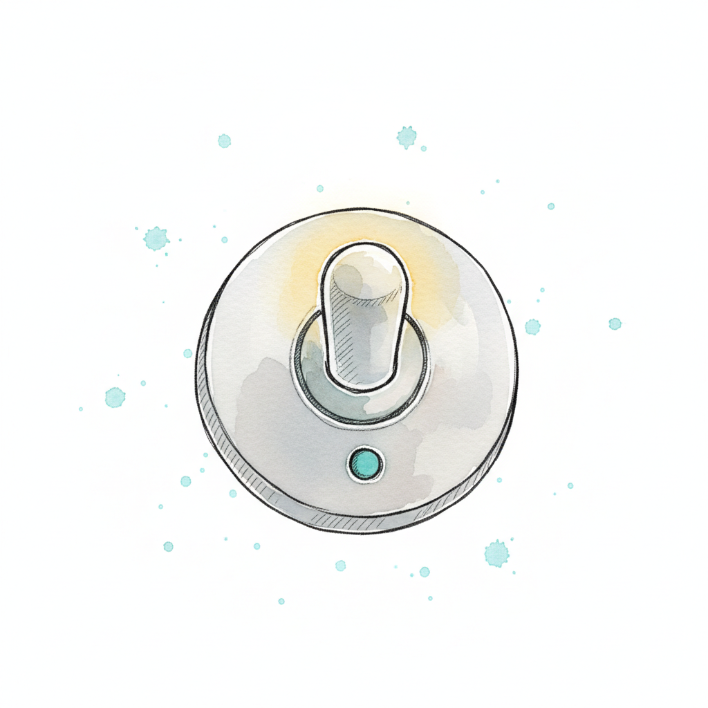 Aquarellzeichnung eines runden Kippschalters mit blauem Indikatorlicht auf weißem Hintergrund.