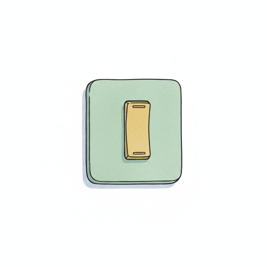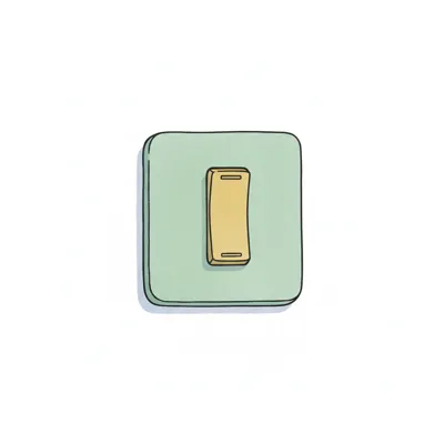 Cartoon-Lichtschalter mit beigem Kippschalter auf hellgrüner Platte, weißer Hintergrund.