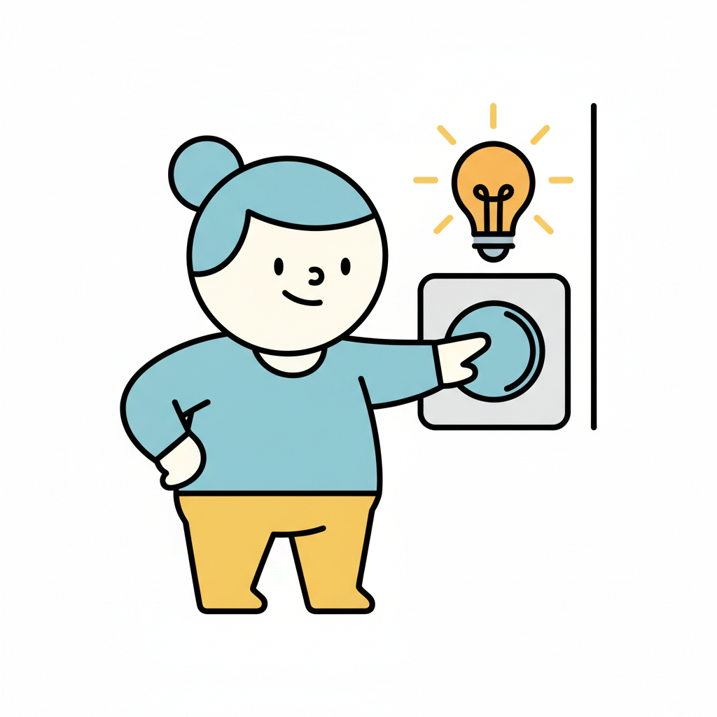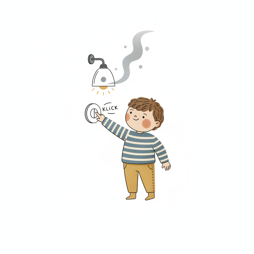 Ein lächelnder Cartoon-Junge drückt einen Lichtschalter, aus dem Blitze kommen.